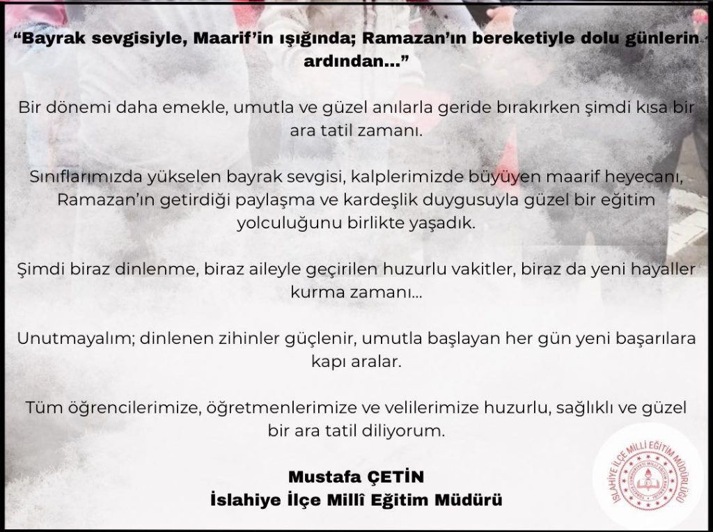 Tüm öğrencilerimize, öğretmenlerimize ve eğitim camiamıza sağlıklı, huzurlu ve verimli bir tatil diliyorum.