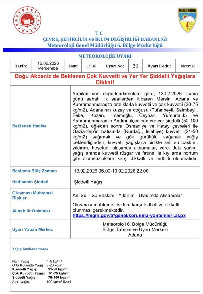 Meteoroloji Genel Müdürlüğü verilerine göre 13 Şubat 2026 Cumartesi günü Gaziantep’in İslahiye ve Nurdağı ilçelerinde yerel olarak kuvvetli sağanak ve gök gürültülü sağanak yağış bekleniyor.