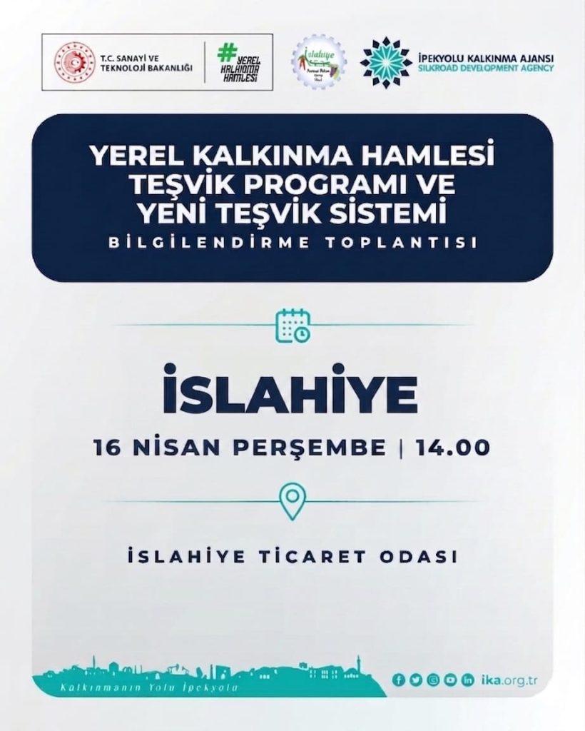 T.C. Sanayi ve Teknoloji Bakanlığı koordinasyonunda yürütülen Yerel Kalkınma Hamlesi Teşvik Programı kapsamında, İslahiye’de bilgilendirme toplantısı düzenlenecek.